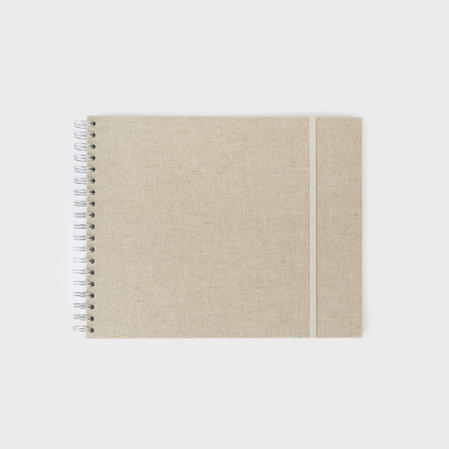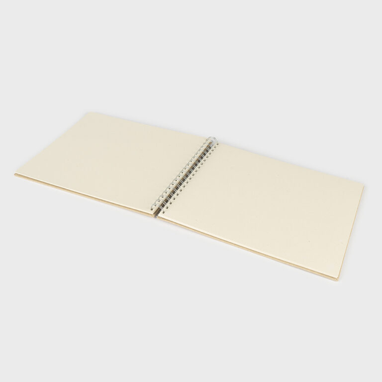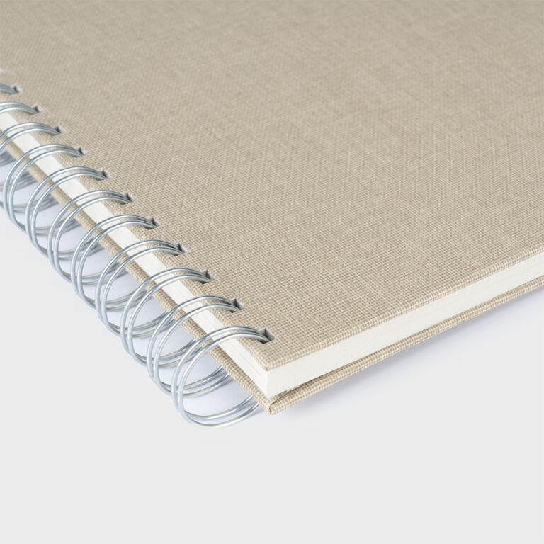 Encuadernación con espiral wyro y con las tapas forradas artesanalmente en tela. Cierre con goma.