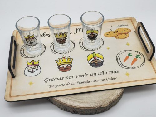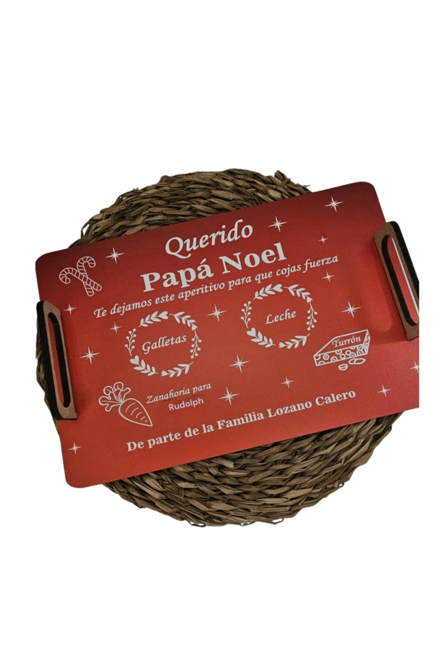 ¿Qué tal si dejamos algo rico a Papá Noel para que repongan fuerzas en su dura noche de trabajo? Pues tenemos el complemento perfecto, esta bandeja realizada en madera con el nombre de la familia.