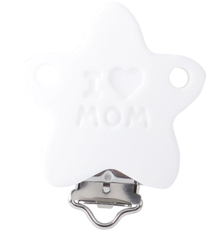 Pinza silicona. Estrella I love mom. Blanco.